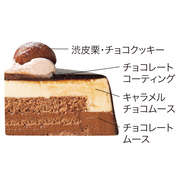 チョコレートムースとキャラメルチョコムースの2種類のムースをチョコレートでコーティングしマロンとチョコクッキーで仕上げた濃厚なチョコレートケーキです。