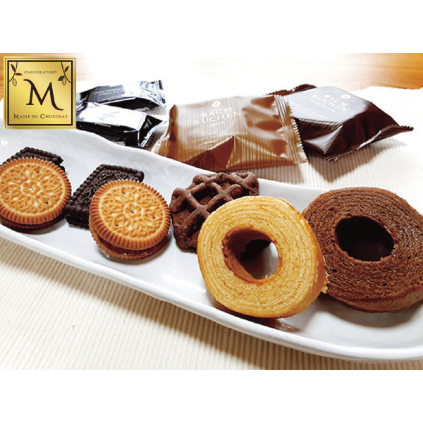 ベルギーワッフル(ショコラ)×2個、バームクーヘン(ショコラ・ミルク)×各3個、クリームサンドビスケット(ショコラ・キャラメル)各6個