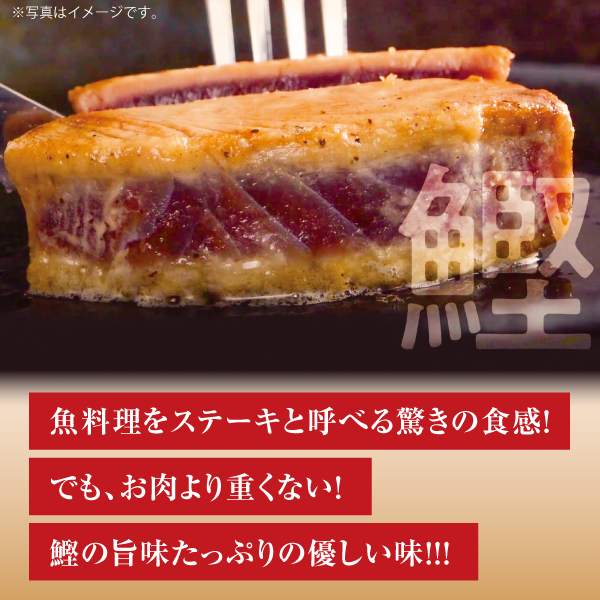 高鮮度で冷凍保管された鰹をステーキ用に厚めに加工し、表面を焼くだけでまるでレアステーキのような新感覚をお楽しみいただけます。