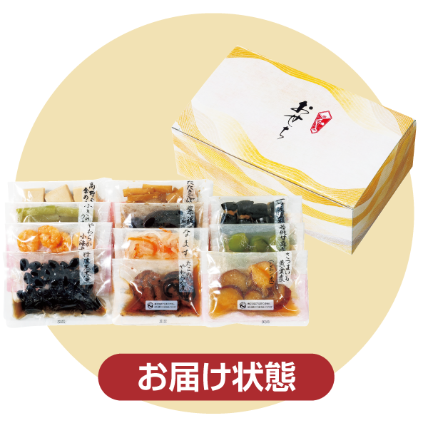 丹波黒黒豆、ふきのうま煮、たたきごぼう、一口巻昆布、なます、たこのやわらか煮、高野豆腐含め煮、やわらか小海老、若桃甘露煮、紫福豆(珈琲味)、さつまいも黄金煮(レモン煮) 計11品目