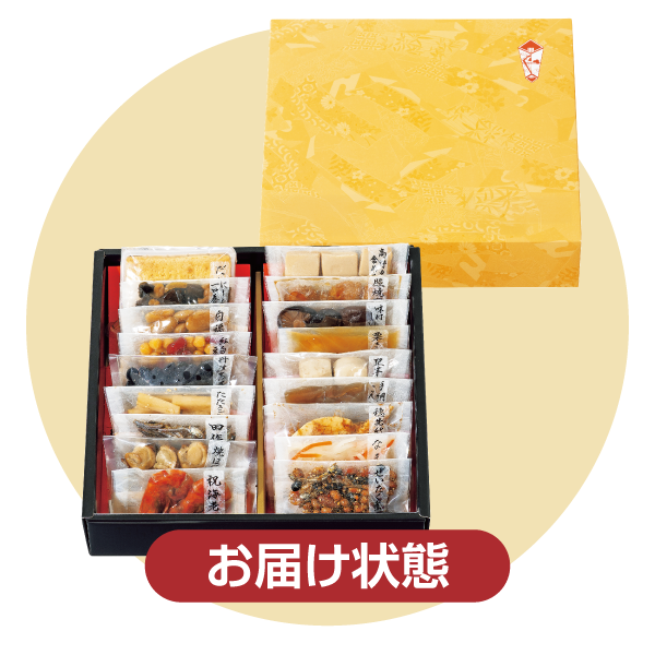 田作り、丹波黒黒豆、里芋含め煮、たたきごぼう、にしん一口巻昆布、栗きんとん、味付しいたけ、穂先竹の子、なます、焼ほたて、だし巻、手綱こんにゃく、高野豆腐含め煮、祝海老、紅白豆マリネ、白福豆、照焼つくね、ぜいたく煮 計18品目