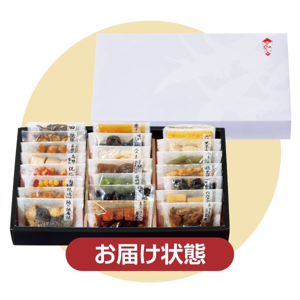田作り、丹波黒黒豆、ふきのうま煮、里芋含め煮、たたきごぼう、にしん一口巻昆布、栗きんとん、味付しいたけ、穂先竹の子、なます、真たらこ角煮、鰆の柚庵焼、焼ほたて、子持ちいかのうま煮、だし巻、手綱こんにゃく、高野豆腐含め煮、祝海老、あさりのうま煮、若桃甘露煮、紅白豆マリネ、照焼つくね 計22品目
