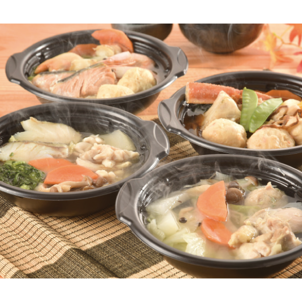 石狩鍋(鮭:北海道産)・かに鍋(蟹:国産)・たらちり鍋(たら:北海道産)・鶏の水炊き鍋(鶏:国産)各200g