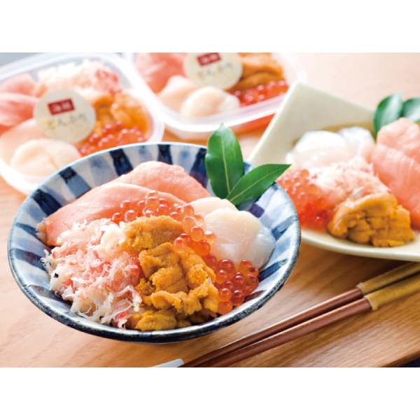 海鮮どんぶりの具(サーモントラウト(チリ産又はノルウェー産他)、帆立(北海道産)、ずわい蟹ほぐし身(ロシア産又はカナダ産他)、いくら醤油(北海道産又はアメリカ産又はカナダ産)、うに(チリ産又はペルー産他))60g4個