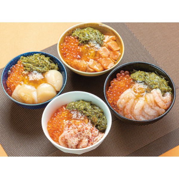 かに:かに(国産)、味付けめかぶ(国内製造)、いくら(アメリカ産)・甘えび:甘えび(カナダ産)、味付けめかぶ(国内製造)、いくら(アメリカ産)・帆立:帆立(国産)、味付けめかぶ(国内製造)、いくら(アメリカ産)・ふくいサーモン:トラウトサーモン(福井県産)、味付けめかぶ(国内製造)、いくら(アメリカ産) 各150g 4個