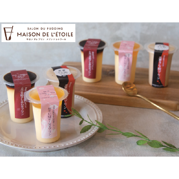 福井UMe-Naプリン(95ml)×2個、とみつ金時のしあわせプリン(95ml)×2個、黒蜜きな粉プリン(95ml)×2個