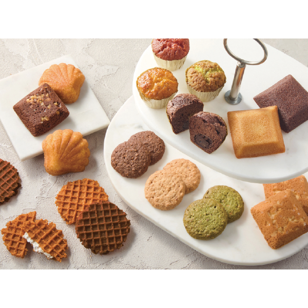 マドレーヌ×1、フィナンシェ×1、フィナンシェ・ショコラ×1、ヌーヴェルガレット(バニラ)×1、ヌーヴェルガレット(チョコ)×1、ミニトリュフケーキ×1、ミニトリュフケーキ(ベリー)×1、ミニトリュフケーキ(ピスタチオ)×1、ミニトリュフケーキ(レモン)×1、フレンチワッフル(バニラ)×3、フレンチワッフル(チョコ)×2、ディアマンド(アーモンド)×3、ディアマンド(抹茶アーモンド)×3、ディアマンド(チョコアーモンド)×3