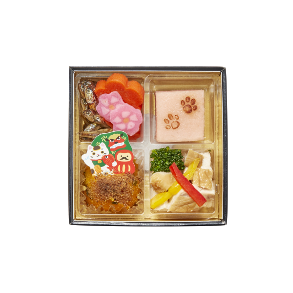 ネコちゃんが好む田作りや、スモークの香りが食欲をそそるスモークチキン、肉球の焼き印に、デザートのかぼちゃきんとんには魚粉をふりかけました。