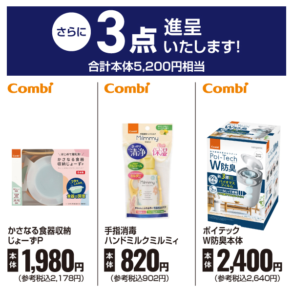 1.かさなる食器収納じょーずP(1,980円)2.手指消毒ハンドミルク ミルミィ(820円)3.ポイテックW防臭本体(2,400円)