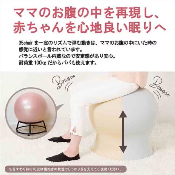対象:生後2ヶ月から。耐荷重100kg。エアポンプ同梱。①寝かしつけに。抱っこしてはずめば、赤ちゃんを心地良い眠りに導きます。台座付きで安定感バツグン♪②スキンシップに。心地良い揺れとママやパパのぬくもりが赤ちゃんに安心感を与えます。③産後の運動に。はずむだけで無理なく続けられ、産後の運動・ストレス解消に効果的。