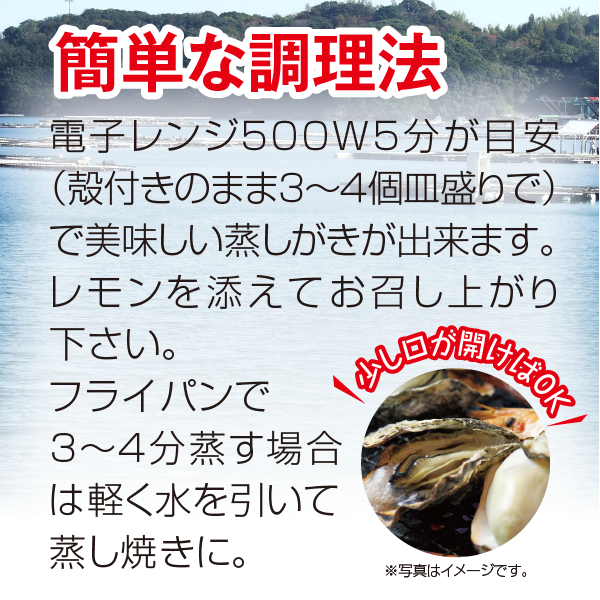 電子レンジ500W5分が目安(殻付きのまま3~4個皿盛りで)で美味しい蒸しがきが出来ます。レモンを添えてお召し上がり下さい。フライパンで3~4分蒸す場合は軽く水を引いて蒸し焼きに。