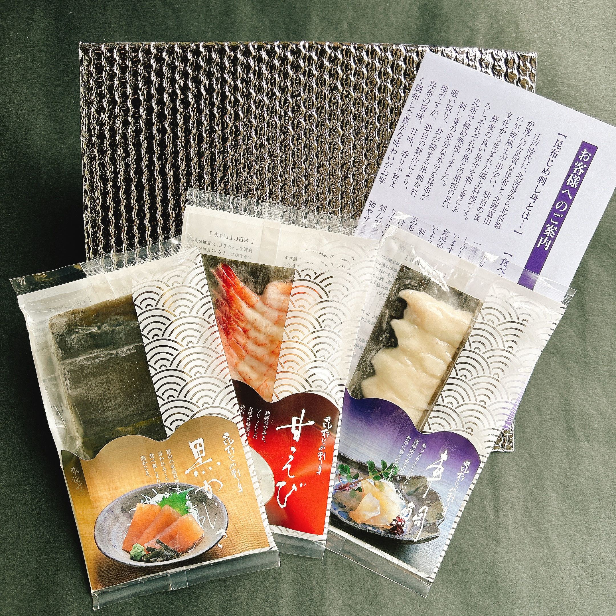 黒かじき(国産)100g・甘えび(デンマーク産又はカナダ産)50g・車鯛(国産)50g 各1個