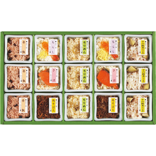 十六穀米【さつま芋】90g×3個、ちりめんごはん90g×3個、赤飯90g×3個、ちらし寿司90g×2個、鮭ごはん90g×2個、肉そぼろごはん90g×2個、ごましお1g×3個